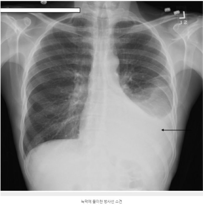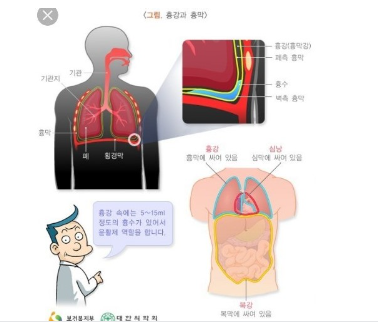 일반적으로 늑막염이라고 하면 여러 가지 원인에 의해서 늑막에 염증이 생기는 것을 말하는데, 이 염증으로 인해서 통증을 일으키고 분비물이 생기면서 늑막강 내에 고여서 흉수가 된다는군요. 흔히 늑막에 물이 고였다고 표현하는 것이 바로 늑막염의 대표적인 증상이라네요.